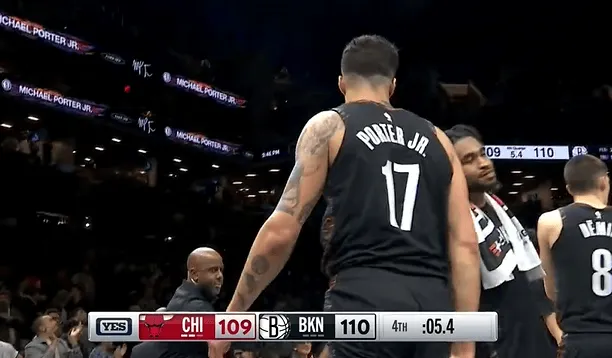 比赛第四节,小波特顶着科比-怀特完成强硬上篮,篮网完成5.4秒准绝杀。
